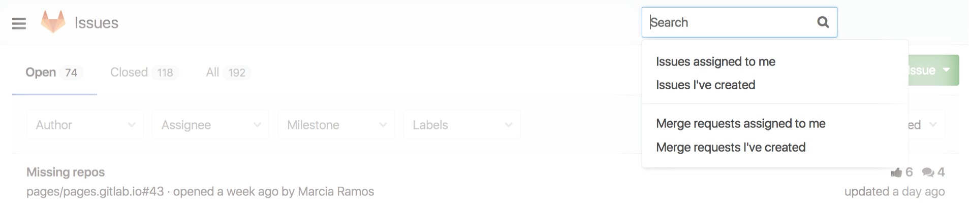 The same process is valid for merge requests. Navigate to your project's Merge Requests tab, and click Search or filter results.... Merge requests can be filtered by author, assignee, milestone, and label.