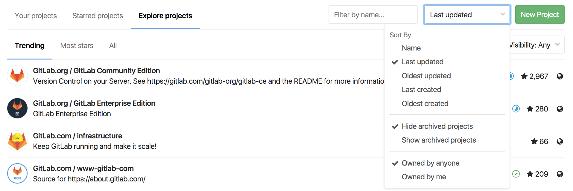 You can also look for the projects you starred (Starred projects), and Explore all public and internal projects available in GitLab.com, from which you can filter by visibitily, through Trending, best rated with Most starts, or All of them.